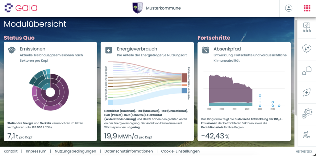 Beispiele für Auswertungen auf dem Dashboard des Digitalen Zwillings. Daten zu den CO2- und THG-Emissionen sind vor allem für Kommunen interessant, gerade, wenn sie historische Betrachtungen ermöglichen. Quelle: Enersis