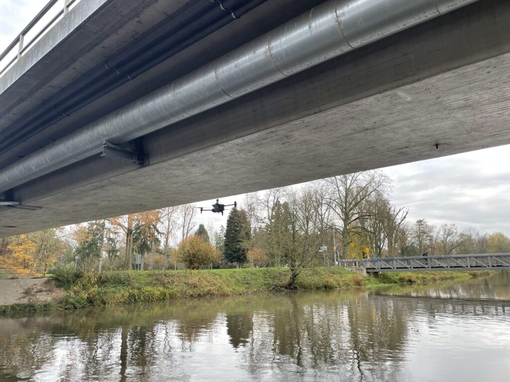 Inspektion einer Fernwärmeleitung unter einer Brücke. Mainova setzt dafür Industriedrohnen ein, die mit zusätzlichen Scheinwerfern ausgerüstet sind.